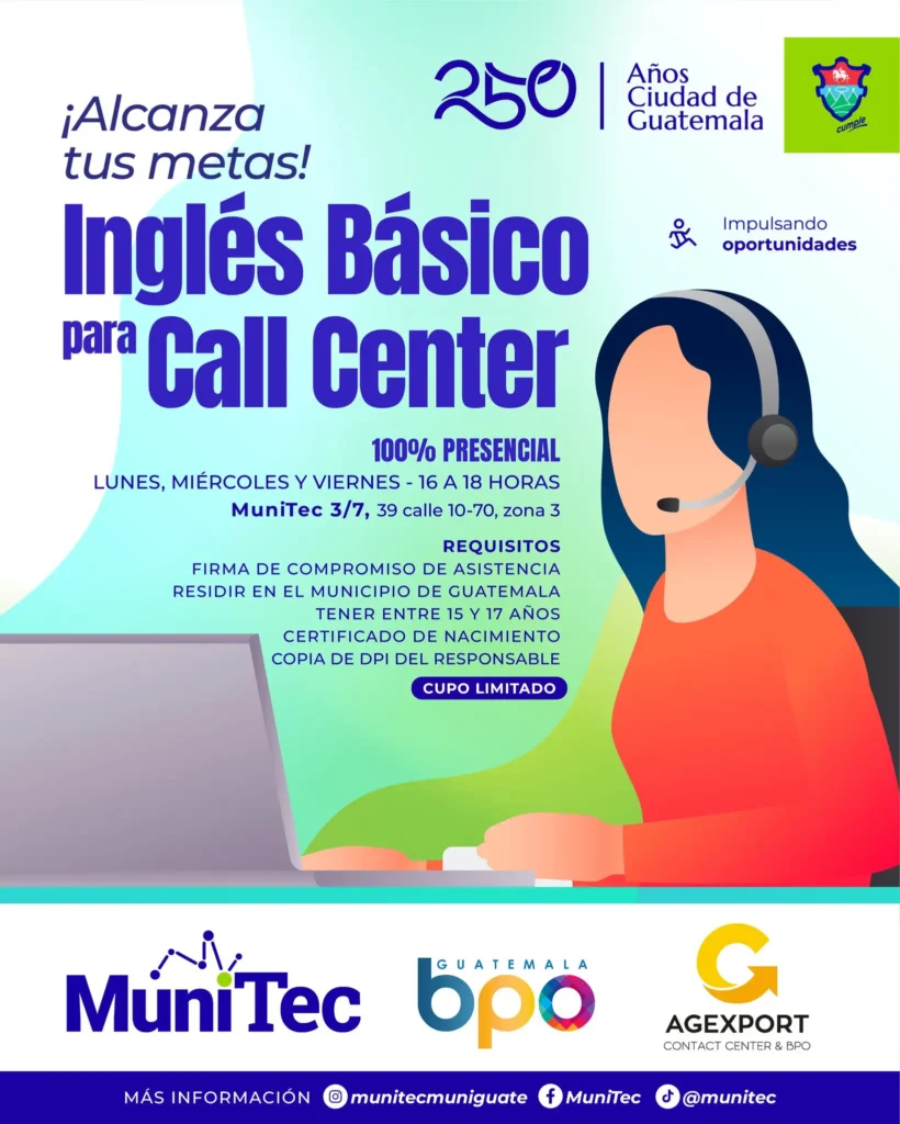 La Municipalidad de Guatemala, a través de su programa MuniTec, ha lanzado una nueva convocatoria para el curso de Inglés Básico para Call Center. Esta iniciativa surge como un esfuerzo conjunto con AGEXPORT y el sector de BPO (Business Process Outsourcing) para brindar herramientas técnicas a los jóvenes guatemaltecos. El objetivo principal es capacitar a la población juvenil en el idioma inglés, permitiéndoles alcanzar el nivel necesario para integrarse en un futuro a una de las industrias con mayor crecimiento económico en el país.