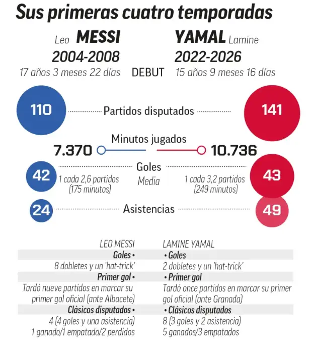 Mientras que Messi, entre 2004 y 2008, disputó 110 partidos y marcó 42 goles, Yamal ha alcanzado los 141 encuentros oficiales, sumando 43 tantos. Sin embargo, la diferencia más abismal se encuentra en la faceta generadora: Lamine registra 49 asistencias frente a las 24 que acumuló el rosarino en su etapa inicial. Esto demuestra una madurez prematura en la toma de decisiones y una presencia física más constante, acumulando más de 10,700 minutos en el césped.