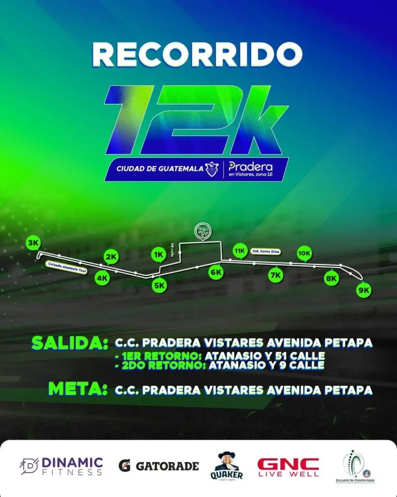 El banderazo de salida está programado para las 7:00 a. m. a un costado del centro comercial Pradera Vistares, sobre la Avenida Petapa. El recorrido de 12 kilómetros transcurrirá por puntos icónicos del sector, contando con el respaldo de marcas como Gatorade, GNC, Quaker y Dinamic Fitness para garantizar la hidratación y seguridad de los 3,000 corredores inscritos.